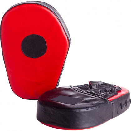 High quality curved training pad made of genuine leather. Light weight durable solid as a pair. Machine mould padding with ball grip palm. Buckle strap with velcro closure. Interior has breathable linning with extra padding to support wrist. Height: 28 cm, Length: 21 cm, Width: 5 cm. Also available in split and synthetic leather